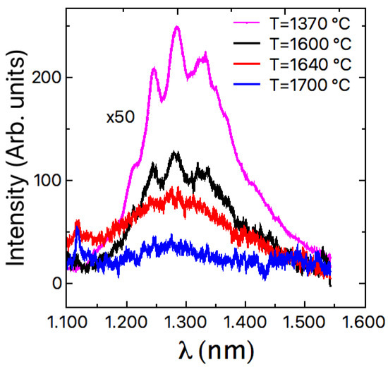 In Figure 6, the PL spectra of the different samples in the wavelength range 1100–1600 nm, are reported. The PL spectra in the usual range between 450 and 900 nm do not show any particular peak structure with the exception of the band-band peak at 540 nm. As reported in previous papers, the SFs in 3C-SiC do not produce a PL peak [14], as in the case of 4H-SiC, because they do not introduce levels inside the band-gap [15]. Then, the emission in this wavelength range of Figure 6 close to the mid-gap of 3C-SiC, is attributed to points defects, as reported in a previous paper where 3C-SiC had been implanted with different ions and annealed at different temperatures [16]. It can be observed that the signal at 1300 nm is extremely high in the seed layer (standard heteroepitaxial growth process at a low temperature, 1370 °C, with silicon substrate) without the homo-epitaxial layer on top. The PL emission decreases, increasing the growth temperature at a fixed growth rate. A similar behavior that confirms what was observed in Figure 6, has been reported previously also by Kinetic Monte Carlo Simulations (KMCS), and by Schottky diodes leakage current distributions in a previous paper on 4H-SiC [17]. It has been observed that the point defects density depends essentially on the growth temperature and the growth rate. Low growth rate and high temperature decrease the point defects density, while high growth rate and low temperature increase the point defects density.