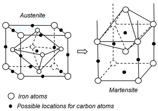For different materials, distinctive alteration scenarios take place in the microstructure during CT [20]. The magnitude of these changes is affected by the treatment process parameters. In most steels, the transformation of retained austenite into martensite [21,22,23,24], fine carbide precipitation [25,26], and uniform distribution of secondary carbides [3,27], as well as interstitial carbon atoms segregation, are the common changes observed in the microstructure after CT execution in comparison to the conventional treatments (quenching and tempering) [28]. Applying the appropriate temperature and soaking time causes substantial transformation of the soft austenite with a face centered cubic (FCC) crystal structure into hard martensite with a body centered cubic (BCC) structure, as shown by Figure 1. In addition, metallurgical alteration of martensite at a lower temperature can be obtained [29,30]. These metallurgical changes in martensite are in the form of a reduction in brittleness and an increased resistance against plastic deformation [31]. The formation of fine and very small carbide particles dispersed within the martensite [25,32] provides more interfaces with the base martensite matrix. These interface increments provide more obstacles against dislocation movements and prevents the foreigner particles from penetrating into the matrix, thereby improving the abrasion wear resistance [33,34]. Due to differences in the crystal size of austenite and martensite, there will be imposed stresses where both coexist. CT, and especially DCT, eliminates these stresses by transforming austenite to martensite. Interstitial carbon atom segregation near dislocations is observed during CT, which acts as growing nuclei for the formation of fine carbide particles on subsequent tempering [35,36].