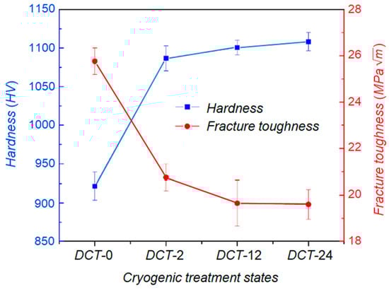 A reduction in the level of retained austenite, or even its elimination, can be substantially obtained if DCT is performed efficiently in a vacuum environment. Leskovšek and Ule carried out DCT on AISI M2 high-speed steel to reach a compromise between hardness and fracture toughness [37]. Furthermore, tool shape and dimensional stability have been examined. It was observed that the volume fraction of the retained austenite, and hardness, have a paramount impact on the fracture toughness. DCT promotes a higher rate of retained austenite transition into martensite which improves the hardness, while at the same time, worsens the fracture toughness. Figure 3 shows the effect of DCT on hardness and fracture toughness and their intercorrelation [38]. The combination of DCT and a vacuum environment encourages a higher austenite to martensite transformation and better dimensional stability. In contrast, shape distortion was detected due to the combined effects of transformational and thermal stresses.