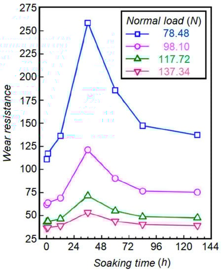 Das et al. tried to correlate the soaking time and wear behavior of AISI D2 to find the optimum soaking duration in the range of 0 to 132 h, and a cryogenic temperature of 77 K [63]. Figure 6 demonstrates the effect of soaking temperature on wear resistance of AISI D2 specimens subjected to different loads. The results provide evidence that there is a strong correlation between soaking time and the precipitation behavior of secondary carbides. Wear behavior of the cryo-treated AISI D2 samples is affected by the volume fraction of secondary carbide particles within the matrix. The optimum time of around 36 h for the soaking zone of the considered material was recommended.