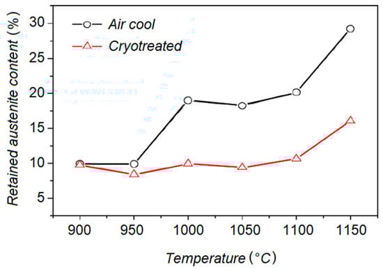 Wang et al. studied the effect of DCT on the microstructure and abrasion resistance of a high chromium cast iron [66]. It was observed that the volume fraction of secondary carbides increased after the destabilization treatment combined with DCT. Cryo-treatment resulted in the transformation of the abundant retained austenite into martensite and finer secondary carbide precipitated formation, which are the main contributors to wear resistance improvement. Figure 7 compares the volume fraction of retained austenite after air cooling and cryo-treatment following the destabilization treatment. Therefore, a higher volume fraction of carbide content provides more interface with the matrix, which promotes obstacles against dislocations and enhances the wear resistance.