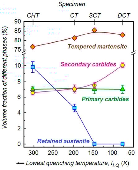 Das et al. studied the advantages of cooling temperature during subzero treatment on AISI D2 steel wear resistance [12,68]. Wear behavior was evaluated by estimating specific wear rates and conducting detailed characterizations of the worn surfaces, wear debris, and subsurfaces using SEM coupled with X-ray. Figure 8 compares the effects of treatment processes, CHT, and subzero treatments (CT, SCT, and DCT) on the volume fraction of different phases within the matrix. It was observed that the lower the temperature of subzero treatment, the higher the wear resistance. RA reduction in retained austenite volume fraction and the simultaneous increment in the amount of secondary carbide particles at lower temperature improved the wear resistance.