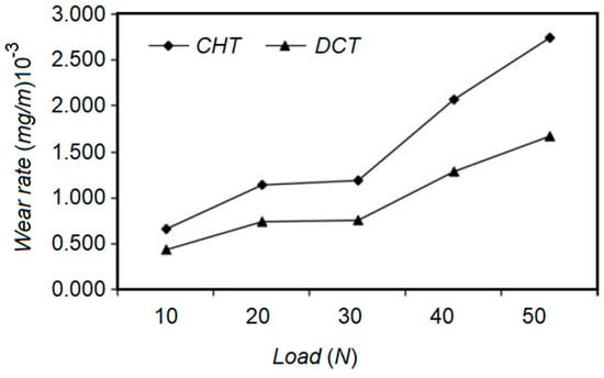 A set of treatments were proposed to study the effect of microstructural alteration on wear behavior of D6 tool steel [62]. SCT at −63 °C and DCT at −185 °C were carried out to examine the effects of treatment types, soaking time, and stabilization. Wear tests were conducted applying pin-on-disk wear tests using different loads and sliding speeds. It was observed that CT improved the wear resistance by means of reducing the amount of retained austenite. However, DCT became more efficient in comparison to SCT, as it encouraged a more homogenized carbide distribution and elimination of the retained austenite. The longer the treatment time, the higher the wear resistance and hardness as more retained austenite was transformed into martensite.