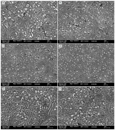 SEM microstructures of (a) CHT, (b) DCT-12 h, (c) DCT-24 h, (d) DCT-36 h, (e) DCT-48 h, and (f) DCT-60 h samples [92].