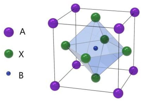 Perovskite is a kind of material with the same crystal structure as calcium titanate (CaTiO3), which was discovered by Gustav Rose in 1839 [1]. The perovskite material (PM) structure formula is generally ABX3, where A and B are two cations and X is anion, as shown in Figure 1 [2]. This unique crystal structure gives it many unique physical and chemical properties, such as broadband bandgap tunability, high carrier mobility, high optical gain, strong nonlinear response, and simplicity of their integration with other types of optical and electronic structures [3,4,5,6,7,8]. Due to its excellent physical and chemical properties, especially optical properties, perovskite materials are now widely applied for constructing photovoltaic solar cells (PSCs) [2,9,10,11].