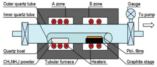 LPCVD are important thin film deposition techniques based on adsorption and subsequent surface reactions of precursor molecules in a high vacuum environment [53]. The schematic diagram of LPCVD instrument is shown in Figure 3. LPCVD is first introduced into fabrication of MAPbI3 perovskites by Luo group in 2015 [34]. Experimental results show that the prepared MAPbI3 films under low pressure have good crystallization, strong absorption, high stability, and long carrier diffusion length. Uniform and well-defined MAPbI3 layers are observed to be fully covered on the substrates, with a roughness of 19.6 nm and grain size up to 500 nm. Next year, Chen et al. have developed a different one-zone LPCVD to fabricate perovskites [54]. In this work, MAI and PbI2 are both loaded on a capped graphite boat, and then reacted at 120 °C for 60 or 120 min under a pressure of 133.3 Pa In this way, efficient PSCs of perovskite modules with a PCE of 6.22% on an active area of 8.4 cm2 are obtained. In addition, the crucial dependence of working pressure on the film formation is also revealed. Then, Qi group synthesize the FAPbI3 using the CVD with a pressure of ~100 Pa and a flow of drying nitrogen [55,56]. Cui group demonstrated an organic cation exchange concept for the preparation of high-quality a-FAPbI3 films using the CVD method under 10−2 Pa [57]. The PCE of the device was 12.4% based on the mesoscopic structure with no hysteresis. Since then, various PMs such as CH3NH3PbI3, (CH3NH3)3Bi2I9, and CsPbBr3 have been successfully prepared in low-pressure or ultra-low-pressure CVD systems [58,59,60,61,62,63,64,65,66,67]. The published works in recent years using the LPCVD method to fabricated perovskite materials are summarized and listed in Table 2.