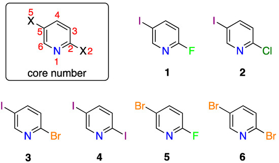 Chemical structures of 2,5-dihalopyridines: 2-fluoro-5-iodopyridine (1), 2-chloro-5-iodopyridine (2), 2-bromo-5-iodopyridine (3), 2,5-diiodopyridine (4), 2-fluoro-5-bromopyridine (5), and 2,5-dibromopyridine (6).