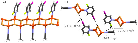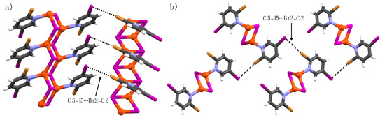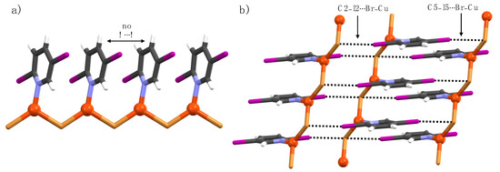 Complex 4b crystallizes in the triclinic space group P-1 and is a 1-D polymeric chain with a CuBr cluster core different to 1b. The Cu(I) ions are coordinated in a trigonal planar fashion by two iodine ions and a pyridine nitrogen (Figure 5). Although the C2- and C5-positions in ligand 4 are iodine, which is typically known for its strong XB-donor ability, the C2–I2∙∙∙Br–Cu halogen bonds are shorter than the C5–I5∙∙∙Br–Cu XBs due to additional polarization caused by C2–I2∙∙∙Cu interactions [3.333(5) Å] and the electron-withdrawing C5-halogen. The short C2–I2∙∙∙Cu contacts are similar to C2–Br2∙∙∙Cu interactions in our previously reported [Cu(2,5-dihalopyridine)2Br2] complexes [31].