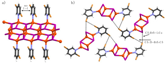 Complex 6a crystallizes in the monoclinic space group P21/n. The asymmetric unit contains one pyridine ligand, two Cu(I) ions, and two iodide ions. The CuI and nitrogen in pyridine ligands of 6a form a 1-D honeycomb-like coordination polymer with Cu6I6N2 nodes, as shown in Figure 6. Both Cu(I) ions are tetrahedrally coordinated. One Cu(I) is coordinated by one pyridine nitrogen, one μ3- and two μ4-iodide ions, and the other Cu(I) is coordinated by two μ3- and two μ4-iodide ions, leading to Cu(I)-centers with NI3 and I4 coordination spheres, respectively. The pyridine ligands are decorated parallel to each other above and below the 1-D chain, with centroid-to-centroid distances of 4.20 Å. The C5-bromine σ-hole and nucleophilic μ3-iodide ion form C5–I5∙∙∙I–Cu halogen bonds whilst the C5-bromine anisotropic electron ′′belt′′ at the orthogonal directions and C2-bromide σ-hole form a C5–I5∙∙∙I2–C2 type halogen bond. The μ4-iodide ion is XB passive.