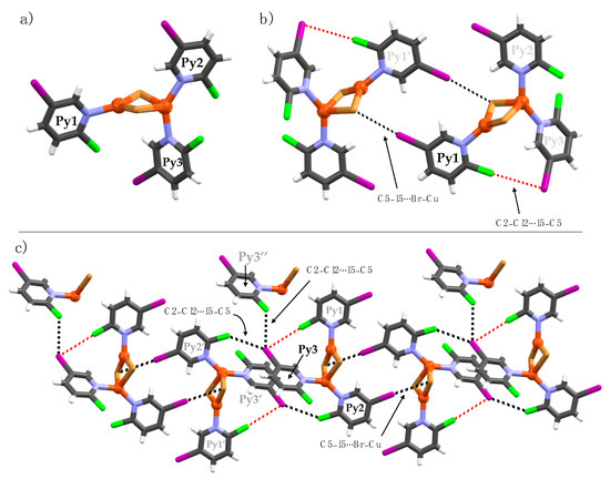 Complex 2b is the only example of a discrete Cu(I)-complex. The asymmetric unit consists of three crystallographically independent pyridine ligands (Py1-Py3) and two Cu(I) ions with a tetrahedral and a trigonal planar coordination geometry, respectively. In the molecular packing, the discrete structures exhibit several halogen bonds and halogen∙∙∙halogen interactions; the respective distances and bond parameters are given in Table 1. Within the asymmetric unit, the C2-chlorine (Py1) and C5-iodine (Py3) attract electrostatically to form weak (Py1)C2–Cl2∙∙∙I5–C5(Py3) halogen bonds with distances of 3.688(3) [∠C2–Cl2∙∙∙I5 = 176.8(4); RXB = 0.99]. The C2-chlorine (Py1) is an XB-donor to the C5-iodine (Py3) XB-acceptor (Figure 7b). These halogen-bond contacts are weak, just below the sum of the van der Waals radii of Cl- and I-atoms [3.73 Å]. The C5-iodine substituents of Py1 and Py2 form relatively strong halogen bonds between two crystallographically independent copper-bound bromines (Figure 7b,c). The C5-iodine of Py3 exhibits two other halogen∙∙∙halogen contacts to C2-chlorines of (Py3′’) [RXB = 0.95] and (Py2′) [RXB = 0.98] to neighboring complexes, as depicted in Figure 7c. The strongest interactions are observed between C5-iodine substituents and nucleophilic Cu(I)-bound bromine ions.