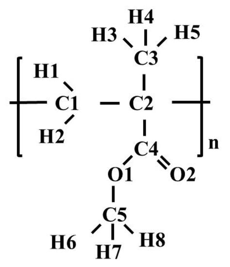 Figure 1 illustrates the monomer unit of PMMA. The polymer chain was built from 100 monomers; then 27 chains were used to construct a three-dimensional structure with an initial density of 1000.0 kg/m3 by Materials Studio [33]. As is well known, force field selection is determinant of the accuracy of simulation results of a specific system. In this study, for MD simulations of PMMA in bulk and in sc-CO2, the OPLSAA (Optimized Potentials for Liquid Simulations All Atom) force field was used [34,35]. Validation of this force field by comparing the PMMA structure and dynamics with neutron experiments was carried out by C. Chen and co-authors [36]. It was shown that the simulation model provides a fair description of real PMMA samples. The Lennard-Jones (LJ) and partial atomic charge parameters of the OPLSAA force field used for PMMA are given in Table 1. For carbon dioxide, we used the model developed by Z. Zhang and Z. Duan [37]. As for cross site-site interactions, we applied the geometric mean mixing rule for both LJ parameters. The temperature and pressure were controlled by a Nose’-Hoover thermostat [38,39] and a Parrinello-Rahman barostat [40], respectively. The leap-frog integrator was adopted to integrate the equations of motion [41]. The cutoff radius was set of 1.5 nm for all interactions. For the long-range electrostatic interactions, a particle mesh Ewald [42,43] with a grid spacing of 0.25 nm and an interpolation order of four was used. The constraints were implemented using the LINCS algorithm [44]. The time step was 1 fs for all the simulations. In order to gain a homogenous sample of PMMA, the polymer was equilibrated in accordance with the heating and cooling scheme as the one used in a few previous studies [45,46]. All the MD simulations were conducted using GPU-accelerated GROMACS v5.0.7 [47]. Processes of energy minimization, canonical ensemble (NVT, 0.5 ns), and isothermal–isobaric (NPT, 5 ns) ensemble were applied to the PMMA sample at 533 K and 0.1 MPa. After that, the sample was subjected to cooling (for t = 0.5 ns) starting from 533 K and ending at 273 K in ΔT = 10–20 K steps. The equilibrium configurations are performed in NPT ensemble with a pressure of 0.1 MPa and temperature of 273K–533K with 10K–20K steps. At the end of this stage, the densities of the samples and the coefficient of thermal expansion were calculated and compared with the experimental ones [48,49].