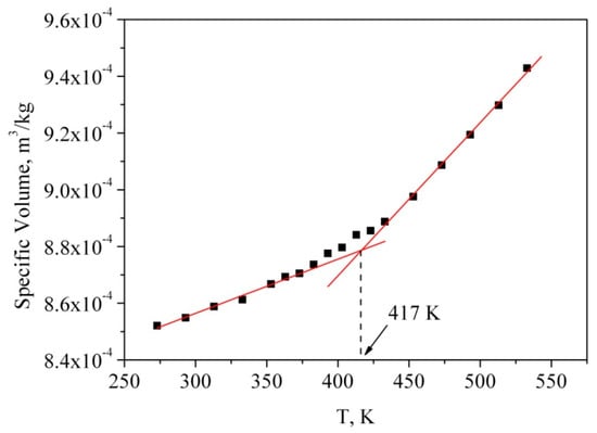 Glass transition temperature (Tg) is a unique property of polymers. Below Tg, polymers behave like glass that is hard and brittle, and above Tg, polymers act like rubber that is soft and viscous [55,56]. Although polymers possess two completely different states below or above Tg, glass transition is a second order phase transition, so that many first order properties, for example, volume, change gradually when the temperature increases. Therefore, Tg can be derived from fitting the intercept of the two linear trend lines at a low and a high temperature, respectively. There are several ways to estimate Tg from MD simulations. In particular, in reference [57] Tg was determined through tracing the variations in the macroscopic (thermal conductivity, volume, thermal expansion and Young’s modulus) and microscopic properties (radial distribution functions, mean squared displacement, non-bonded energy) of the polymer during temperature cooling scans. The authors [57] found that the density and volume method was less time consuming in determining the Tg than the thermal conductivity and Young’s modulus method. Therefore, we calculated the specific volume, i.e., the inverse density, at each temperature during the cooling process. The temperature dependence of the specific volume of the bulk PMMA is shown in Figure 2.