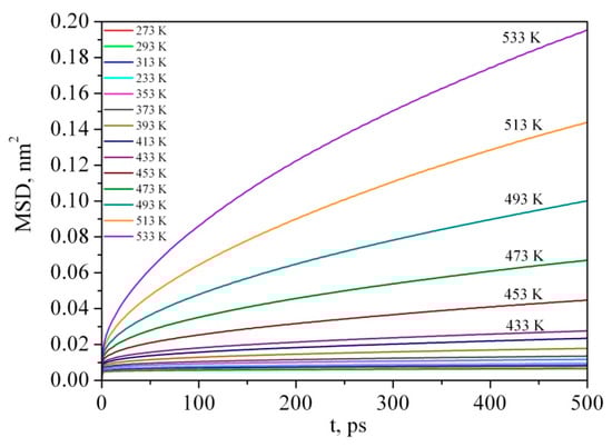 In reference [57] the same behavior of temperature dependence of MSD curves of PMMA is observed. Namely, the MSD curves remain constant with variation in temperature below 470 K and MSD values notably increased with temperatures raised above 470 K. The difference between our results and data presented in reference [57] is probably due to a small number of PMMA molecules in the MD cell (only 3) which was simulated by M. Mohammadi and coauthors compared with our simulation box containing 27 molecules.