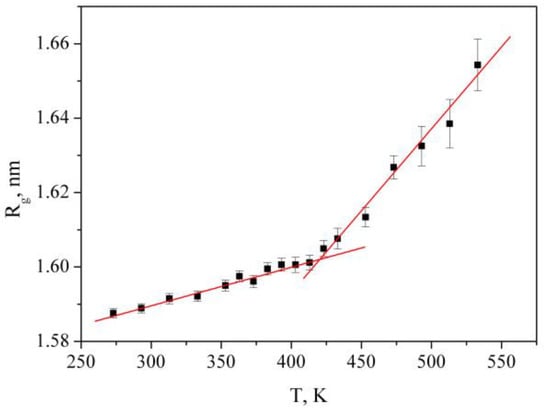 where mi is the mass of site i and ri is the position of site i relative to the center of mass of the molecule. As can be seen from Figure 4, there is an abrupt change in the slope of Rg as a function of temperature around 417 K. Thus, at temperatures above 417 K, significant changes in the structure of the polymer are observed, i.e., the polymer transitions from a glassy state to a highly elastic state. It should be noted that the Tg value obtained from the temperature dependence of the specific volume of the bulk PMMA coincides with the value obtained from Rg(T).