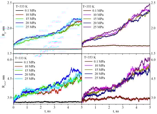 The first stage of dissolution of any polymer is its swelling. Swelling is the process of absorption of a low molecular weight solvent by a polymer, accompanied by an increase in the mass and volume of the polymer and a change in the conformation of its macromolecules. Because the PMMA solubility is negligible in sc-CO2 (it is less than 0.001 percentile weight of the extracted amount per unit mass of CO2 at 333 K and 20 MPa) [25], the dissolution process stops at the stage of swelling, and, thus, one can discuss limited swelling of PMMA in supercritical carbon dioxide. PMMA swelling in sc-CO2leads to an increase in the end-to-end distance Rete and radius of gyration Rg (Figure 5) in comparison with the bulk PMMA where Rete and Rg fluctuate around a constant value during the entire simulation time.