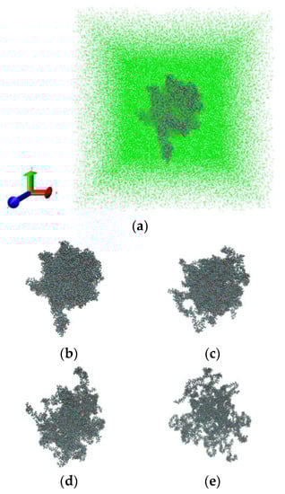 Snapshots of PMMA in sc-CO2 (green) at 333 K and 25 MPa: 0 ns (a,b), 2 ns (c), 5 ns (d) and 10 ns (e). The solvent molecules have been deleted from figures (b–e) for clarity to highlight polymer swelling.