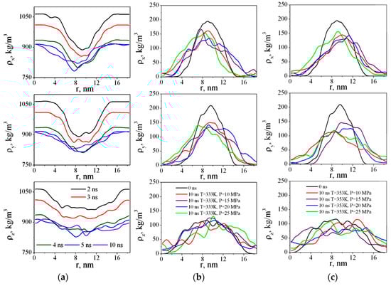 Figure 7a shows dependences ρx(r), ρy(r), and ρz(r) after 2, 3, 4, 5, and 10 ns. Figure 7b,c show the density profiles of PMMA versus time during polymer swelling in sc-CO2. As we can see, in the first four nanoseconds after the beginning of the simulation, more dramatic changes in the PMMA structure are observed. The CO2 molecules gradually diffuse into the polymer and the difference in the solvent density at the edges of the box (i.e., outside the polymer) and closer to the center of the box (i.e., in the area where the polymer is located) decreases. The density profiles of PMMA become wider and lower (Figure 7b,c), meaning the polymer adsorbs the solvent molecules and swells.