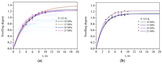 Dependence of polymer swelling degree (symbols) and theoretical approximations of the MD data according to Equations (7) (lines) at 333 K (a) and at 353 K (b).