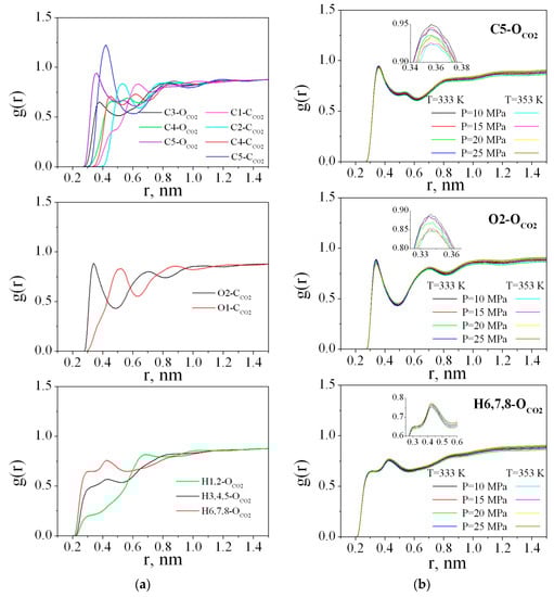 Radial distribution functions of PMMA and CO2 atoms: (a) at 333 K and 25 MPa; (b) C5-OCO2, O2-CCO2, and H6,7,8-OCO2 for all thermodynamic states.