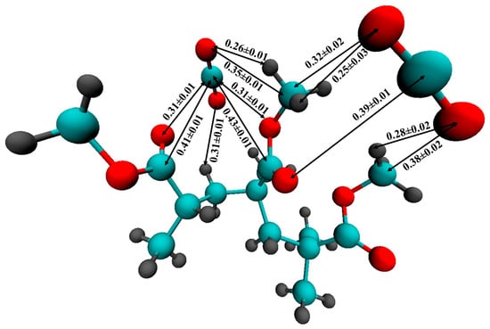 The complex of a PMMA fragment with two CO2 molecules according to the CPMD. All the distances are given in nm. The averaging of the distances was made over the last 120 fs. (The red spheres denote the oxygen atoms, the gray ones represent the hydrogen atoms, the cyan ones represent the carbon atoms).