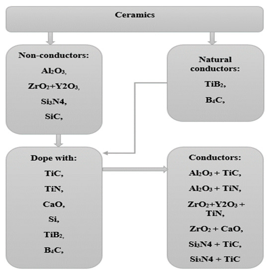As per literature, EDM requires any materials to have electrical conductivity of 10−2 Ω−1 cm−1 for it to be eligible to be machined by EDM. Hence, ceramics like TiN or SiSiC or TiB2 can be machined by EDM as they comply with the electrical conductivity requirement. However, insulator ceramics like Aluminum nitride (AlN), Zirconium oxide (ZrO2), and Silicon nitride (Si3N4) do not comply with this conductivity requirement. Three basic mechanisms can be used to generate or enhance electrical conductivity of ceramic materials having conductivity above this value [18]. These are natural electrical conduction by free lattice electrons, doping with conductive materials, and adding impurity atoms into the non-conductive ceramics. Figure 1 shows the commonly used ceramics and the doping materials used to enhance the conductivity of ceramics. Top right block shows the ceramics that are conductive naturally, and top left block represents the non-conductive ceramics which can be made conductive by doping with bottom left block elements. In this way, non-conductive ceramics that can gain certain conductivity are presented by the bottom right block. By enhancing the electrical conductivity of ceramics above critical conductivity required for EDM, machining can be carried out using the EDM/micro-EDM process. Yoo et al. [19] reported one of such cases where SiC was reinforced by Yttrium nitrate. In another study, Kun et al. machined Si3N4 ceramics using EDM by incorporating TiN. Nevertheless, this incorporation of secondary electrically conductive phase seems to be affecting the mechanical properties; as such, TiN can reduce the fracture toughness, hardness, and flexural strength of ZrO2-TiN ceramics [20].