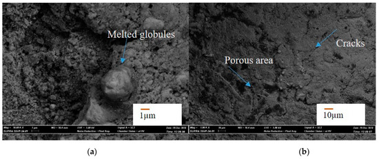 SEM images of the machines surface at the bottom of the blind micro-hole. (a) melted globules on the surface; (b) thermal cracks and porosity on the surface.