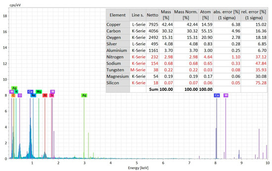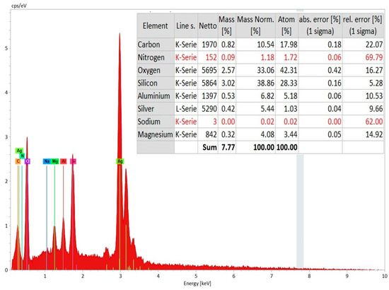 In order to confirm the machining surface from coating layer, EDS spectrum analysis (Zeiss Supra 35 VP, Bruker Espirit 2.0, Zeiss, Germany) was carried out on the top of the hole (coating layer) and the bottom of the hole (machined surface). Figure 7 shows the EDS spectrum analysis of the machined surface that was taken from the bottom of the micro-hole. The elemental composition confirms the presence of aluminum and nitrogen on the machined surface. The source of copper and tungsten present on the surface is the tool electrode. In addition, there is a significant amount of oxygen present on the machined surface, as can be found from Figure 7. Moreover, carbon present on the surface is from the decomposition of dielectric. On the other hand, the EDS spectrum on the top surface of the machined hole (on the layers of silver coating) indicates the presence of silver, oxygen, carbon, and silicon on the coating layer, with no or minimal existence of aluminum and nitrogen, which are the main constituents of the ceramics (Figure 8).