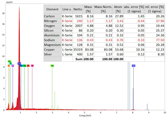 EDS Spectrum analysis of conductive copper tape layers at the area near the top of the micro-hole with elemental composition.