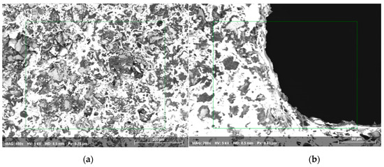 In the first case, a successful machining of hole with 700 µm machining depth using 600 µm diameter tool is presented. Figure 5a shows the SEM image of the top surface of the blind micro-hole machined in AlN ceramics using two layers of silver coating along with silver nanoparticles. The first layer of silver coating along with silver nanoparticles were sintered on the ceramic surface to be machined. The sintering was done in a sintering oven at 900 °C for 60 min. The second layer of silver is then provided on top of the first layer by manual paint brush and sintered in oven at 900 °C for 60 min. Copper tungsten electrode was used for this case. The double layer of conductive coating can be easily observed from the magnified SEM images taken at the edge of the micro-holes, as shown in Figure 5b. There is a clear sign of machining at depths below the two conductive layers of silver coatings. As per the SEM image, machined hole diameter is 759 µm, which gives an overcut of 80 µm approximately for blind micro-hole. Figure 6a,b shows SEM images of the machined surface topography. It can be seen from the images that the machined surfaces are very rough, although the discharge energy used for machining was not very high. The reason behind this higher roughness can be explained with the no tool rotation condition, which let settle down the removed material on the bottom of the hole. SEM image also confirms that material removal mechanism for this ceramic is basically intergranular cracking, which leads to the thermal spalling of whole grains from the machined surface during EDM process. Therefore, thermal composition of ceramics releasing the nitrogen gas as well as thermal spalling act as removal mechanism for this ceramic. The machined surfaces also indicate melting and evaporation, other than thermal spalling as the dominating material removal mechanism. In addition, the machined surface contains many thermal cracks and porosity on the surface, as shown in Figure 6b.