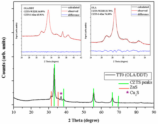 XRD pattern of CZTS samples after soft thermal annealing (TT0), the inset is XRD pattern of samples oleylamine/1-Dodecanethiol (OLA/DDT) (data collected with CoKα radiation) and OLA (data collected with CuKα radiation) at TT0 analyzed by Topas.