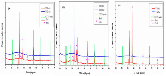 XRD pattern of CZTS samples at different thermal treatments: (a) TT1-A1, TT2-A2 (b) TT1-B1, TT2-B2 and (c) TT1-C1, TT2-C2.
