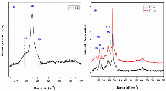 Figure 3a shows the Raman spectra of a CZTS thin film after TT0. CZTS peaks fall at 288, 330 and 360 cm−1, respectively [22]. The stronger peak at 330 cm−1 is due to the A1 symmetry and it is related to the vibration of the S atoms in CZTS [23,24]. Peaks at 288 cm−1 are attributed to the vibration of the Zn atoms and S atoms with some contribution from the Cu atoms in CZTS lattice [24]. The secondary phase Cu2S, observed in the XRD pattern (Figure 2) is not observed in the Raman spectra, a feature made evident by the absence of peaks at 475 cm−1 [25]. This suggests that Cu2S could be in the bulk of the film, seen by XRD, but not easily reached by Raman.
