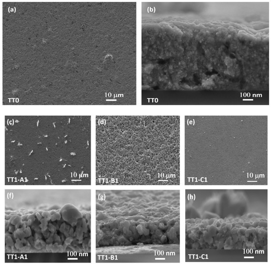 Basically, the surface images of all samples of CZTS films after TT1 under different thermal conditions (Figure 4c–h) revealed a crack-free and uniform morphology with grains much larger (~70–100 nm) than in the case TT0 (b).