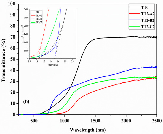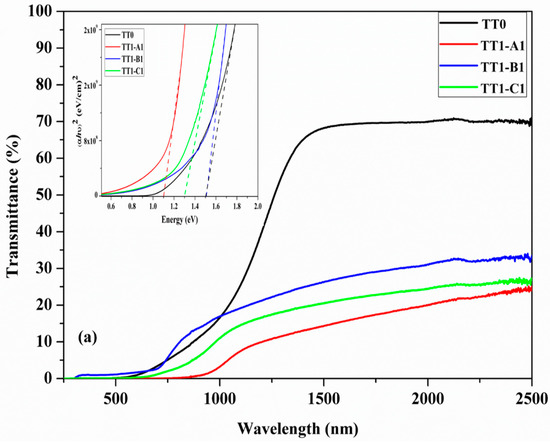 Figure 5a,b shows the transmittance spectra of CZTS films after TT0, TT1 and TT2 under different thermal conditions. In each figure, the corresponding (Eα)2 curve is also shown. The spectrum of the film at TT0 shows a high transmittance in the infrared region (nearly 70% at 1500 nm), but the value reduces for all samples after the first thermal treatment (TT1), down to ~20% and shows a slight increase after the second annealing TT2. The transmittance of TT1 samples is lower than TT2 samples, due to the incomplete formation of CZTS NCs and the residual presence of intermediate phases, such as SnS and/or CTS, as revealed by XRD and Raman measurements.