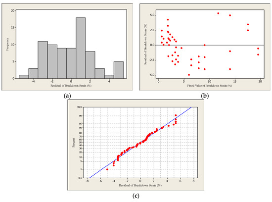 The residual plots: (a) histogram, (b) residuals vs. fits and (c) normal probability of the breakdown strain regression model of the horseshoe pattern.