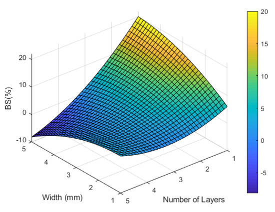 Moreover, the results in Table 3 indicate that the square of the line width has a more significant effect on the breakdown strain compared to the line width alone. Increasing the line width gives the printed pattern a higher ability to endure strain. Specifically, as the width increases (more nanoparticles), the possibility of the particles dispatching from each other decreases (larger area) and accordingly the line maintains its electrical conductivity. On the other hand, increasing the number of layers increases the amount of bulk material that will ease the formulation of cracks in the printed patterns. The gauge factor, which is related to the change in the resistance and the amount of breakdown strain, increases as the resistance () decreases, which in return depends on the number of layers and line width as indicated in Equation (4). In particular, these parameters control the cross sectional area of the line. From the p-values, it could be noted that the effect of the line width on the gauge factor is smaller than the number of layers.