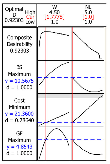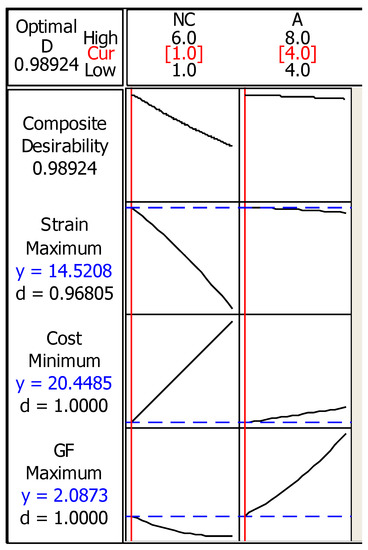 The lowest ink cost in the dataset (12.61 × Euro) was entered as the minimization target of the ink cost, whereas a gauge factor of 2 was used as the maximization target. As it can be seen in Figure 5, the minimization of the cost had the lowest desirability among the other responses, where the composite desirability of the outputs was satisfactory at the optimal line width of 1.78 mm with one printed layer. The predicted breakdown strain of the line at these parameters was 10.57% with an ink cost of 21.36 × Euro and gauge factor of 4.85. The experimental validation of the obtained results is essential in order to evaluate the accuracy of the developed model before proceeding with these results for the optimization of the horseshoe patterns. Six straight lines with 1.78 mm line width and one printed layer were tested in order to validate the optimization model, the average maximum breakdown strain of these lines was 11.5% with an error of 8.83%.