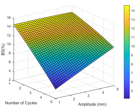 It can be depicted from Table 5 that the breakdown strain of the horseshoe pattern is highly affected by the amplitude and number of cycles, as well as the interaction between them, with p-values < 0.01, while there was no statistical significance for the square of these parameters. The breakdown strain coefficient demonstrates that increasing the number of cycles and the wave amplitude increases the surface area that is exposed to the force and increases the stress applied on the traces, which in return, decreases the ability of the pattern to sustain strain. It can be noted that only the constant, number of cycles, and the interaction between the number of cycles and the amplitude have significant statistical significance on the gauge factor, where increasing the number of cycles increases the sensitivity of the pattern to the strain.