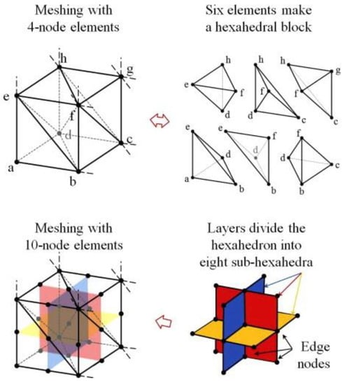 Tetrahedral (four-node) and hexahedral (eight-node and 20-node) elements are commonly used in the finite element mesh. The solid body is replaced with the selected type of elements and the stress–strain constitutive equations are solved at each node. (Figure taken from Kim, J., & Bathe, K. J. [15] and reprinted with permission).