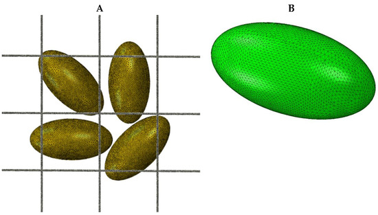 (A) A representative model of a scaffold with embedded cells. The cell surface nodes are in contact with the scaffold’s rod-like structure. The force applied to the scaffold results in strain on cell surface nodes. (B) A detailed tetrahedral mesh of the ellipsoid shaped cell with a 100-µm major axis and a 50-µm minor axis that contains 6000 nodes.