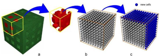 Cellular-scale FE models have been developed to determine cell viability by predicting the biophysical and biomechanical responses of scaffolds. Byrne et al. simulated cell migration and proliferation in a multi-scale model of scaffold, granulated tissue, and cells (Figure 3) [47]. Their model allowed lattice cells to proliferate in three dimensions based on a random walk algorithm. Depending on cell type, the model allowed either proliferation or migration during the simulation. Elsaadany et al. developed a multi-length scale FE model to predict regional strain gradients in a cell-embedded collagen construct [22]. The model used in their study had a macro component focusing on the mechanics of the collagen construct and a micro-component predicting the cellular responses to the strains. Their model demonstrated its ability to predict applied strains being transferred from the collagen scaffold to the embedded cells for cell viability analysis. Riccardo et al. used a similar approach to model a bioreactor chamber and predicted the strain effects of a macro-scale scaffold on biomass growth at the micro-scale of the cellular construct [48]. Similar models have been developed by other researchers to predict cellular biomechanical responses and viability under varying magnitudes of applied strains [46], as well as cell differentiation based on fluid shear stress [49]. These models with cell–matrix interfaces can be used to optimize scaffold design and applied stress and strain magnitudes to induce suitable cellular responses [46]. Sandino and Lacroix simulated perfusion fluid shear stress as a mechanical stimulus instead of fluid velocity, to stimulate tissue growth in a porous scaffold [49]. Their model predicted variation in the fluid shear stresses as the cells seeded in the scaffold formed new tissue. These published multi-scale models have demonstrated the ability to predict cell activity under applied strains and shear stress loads on the scaffold structure and can contribute to scaffold design by accurately predicting the cellular responses inside these changing structures [22,49].