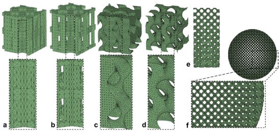 Six scaffold designs with varying structure and porosity; hexagonal prisms with (a) 55% and (b) 70% porosity, gyroid with (c) 55% and (d) 70% porosity, (e) gyroid with height-based porosity gradient, and (f) gyroid with radial-based porosity gradient. (Figure is taken from Olivares et al. [24] and reprinted with permission).