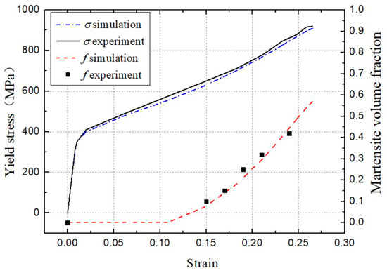 where denotes the strain hardening effect which is expressed as an exponential function of the equivalent plastic strain; denotes the martensite transformation hardening effect which is an function of the martensite volume fraction; is the initial yield stress of 301LN steel; , a and n are the material parameters; denotes the martensitic transformation hardening modulus.