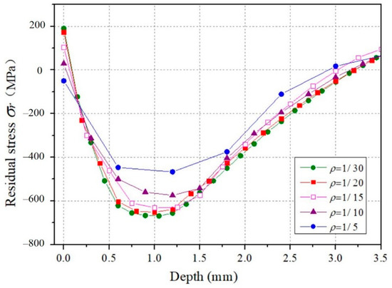 In Explicit finite element simulation, the minimum element size is of great significance for calculation accuracy and efficiency. A few studies on mesh convergence have been carried out. Frija [31] has conducted a sensitivity study to optimize the dimensions of the element in refined zone by comparison of the analytical solutions of the elastic Hertz contact problem. Klemenz [32] has used the size of elements equal to one-tenth of the dimple diameter in the multiple shots model. Bagherifard [33] has chosen the size of element in the impact zone equal to one–twentieth of the dimple diameter. Obviously, the accuracy of the results mainly depends on the ratio of the element size and the dimple diameter. Define the parameter ρ for the ratio of element size to the dimple diameter. A single shot impact was simulated to determine the suitable element size of the target material. Firstly, the diameter of the dimple on the surface was estimated. After that, a mesh convergence study with different values of ρ was carried out. The effect of ρ on residual stress σr along the depth is shown in Figure 2. It represents that the residual stress distributions for ρ = 1/20 and ρ = 1/30 are almost identical. So it can be inferred that stopping the refinement of the mesh at ρ = 1/20 does not result in excessive variation of residual stress. Eventually, a finer mesh was used on the impact zone with a minimum element size of 0.15 mm for the single shot-peening simulation, and 0.03 mm for the random multiple shot-peening simulation. The developed single shot and 3D random multiple shot models are shown in Figure 3a,b respectively. The calculations were running on a computer with 4-core CPU (Central Processing Unit) at 3.4 GHz.
