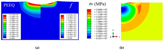 Distributions of (a) equivalent plastic strain (PEEQ) and martensitic volume fraction (f); (b) radial residual stress (σr).