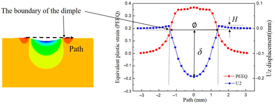 As we know, the experimental measurement of the shot velocities has high complexity [34,35]. However, the size of dimple by impact can be easily obtained by measuring. Therefore, it is feasible to relate the shot velocities and the dimple sizes in order to evaluate the shot velocities. The first thing to do is to obtain the dimple diameter. Figure 5 shows the normal displacement (Uz) and the PEEQ along the path which is defined across the center axis of dimple. In this work, the nodes with the Uz be equal to zero on the surface within the pile-up are defined as the boundary of the dimple. Therefore, the dimple diameter Ø, the dimple depth δ and the height of the pile-up H can be obtained. From Figure 5, the PEEQ at the boundary is 0.19. According to Miao’s definition [27], the points on the surface with the PEEQ larger than 0.19 can be considered as the impacted material. This definition will be applied in the following coverage simulation.