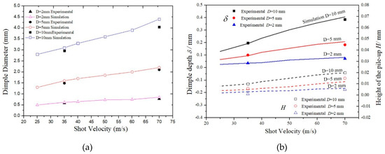 In single shot-peening simulations, the dimple diameters as a function of shot velocities are obtained. Figure 6a accordingly shows the plots of three different shot diameters: 2, 5, and 10 mm. Experimental results from Reference [20] are also be plotted in the figure. Additionally, the dimple depth δ and the height of the pile-up H are plotted and compared with the experimental data, as shown in Figure 6b. It can be seen that the simulated results are in good agreement with the experimental results. As expected, an increase in velocity causes an increase in the dimensions of the dimple, and an increase in shot diameter also causes an increase in the dimensions of the dimple. Besides, just by knowing the dimple diameter which are easily obtained experimentally, the shot velocity can be deduced by simply referring to the right shot diameter curve.