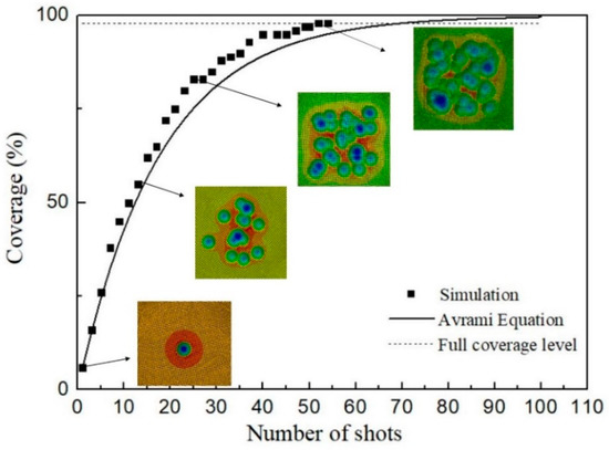 Surface coverage, which indicates the amount of target area treated by shot peening, is an important parameter to evaluate the shot-peening process [28,36]. The relationship between coverage and number of shots (or shot-peening time) is an urgent issue needed to be solved. Most studies have been carried out based on experiments and theoretical models [37,38]. Only few studies have related the coverage to the number of shots by numerical simulation. Recently, Avrami equation has been applied to calculate the number of shots needed to achieve full coverage in simulation [39]. The equation is given by: