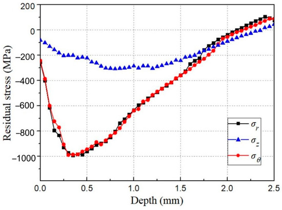Distributions of the residual stress σr simulated with the Johnson–Cook model and the proposed model are compared, as shown in Figure 12. The Johnson–Cook model describes the evolution of the hardening plastic surface in terms of the plastic strain and the equivalent plastic strain (Equation (8)). The parameters of the Johnson–Cook model as listed in Table 3 are determined by numerical optimization, the goal of which is to fit the curve of yield stress–strain in Figure 1 as well as possible. As Figure 12 shows, the result differences between these models are significant in the surface layer within 1.0 mm. Additionally, the difference is reduced in greater depth where the response of the target material behavior to shot-peening process is weakening. This result corresponds to that obtained in Figure 11. Moreover, it can be seen that the variation trends of the residual stresses and the locations of the maximum values are almost the same. However, the values of maximum compressive residual stress predicted by the constitutive models vary greatly. The value by the Johnson–Cook model is about 12% higher than that by the proposed model. The results are almost consistent with Sanjurjo’s work [19], in which they found that the numerical prediction by the Johnson–Cook model overestimated the residual stress. Results confirm that both the effects of TRIP, isotropic hardening and kinematic hardening have to be properly taken into consideration in the constitutive model of 301LN steel in order to make an accurate prediction of the residual stress field by shot peening.