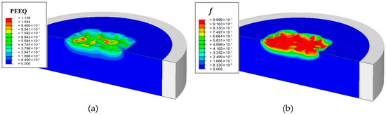Distributions of (a) equivalent plastic strain, PEEQ; (b) the martensitic volume fraction, f.